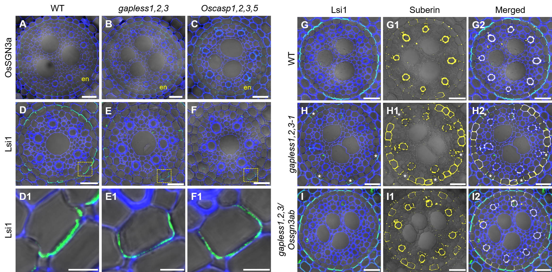 图2 OsSGN3a、Lsi1和木栓质在野生型、gapless1,2,3及 Oscasp1,2,3,5突变体内皮层中的定位与累积分析