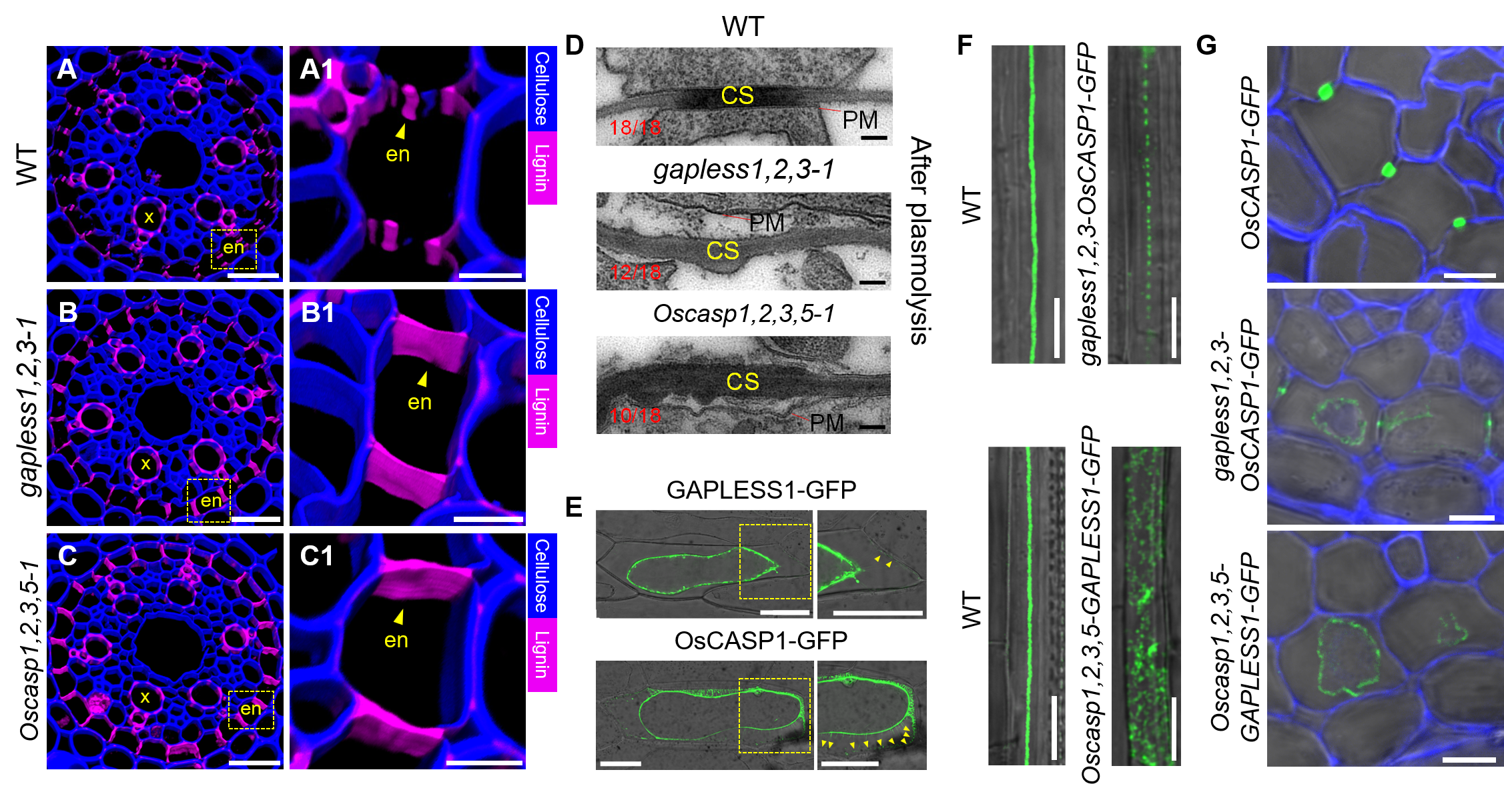 图1 木质素、GAPLESS1和OsCASP1在野生型、gapless1,2,3及Oscasp1,2,3,5突变体内皮层中累积与定位模式分析