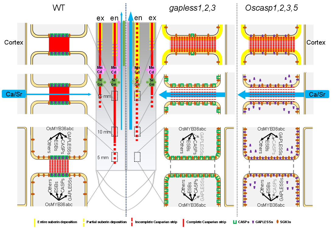 近日,广西大学亚热带农业生物资源保护与利用国家重点实验室夏继星课题组在国际著名学术期刊《Science Advances》在线发表了题为“The GAPLESS-OsCASP complex mediates Casparian strip formation for proper localization and abundance of endodermal proteins in rice”的研究论文。该研究揭示了水稻内皮层凯氏带的形成依赖于GAPLESS-OsCASP复合物对相关蛋白稳态的维持,并且这一过程对调控内皮层蛋白的定位与丰度起着决定性作用。